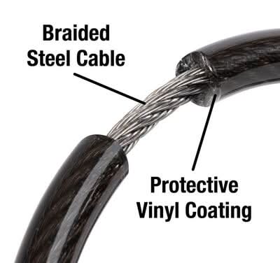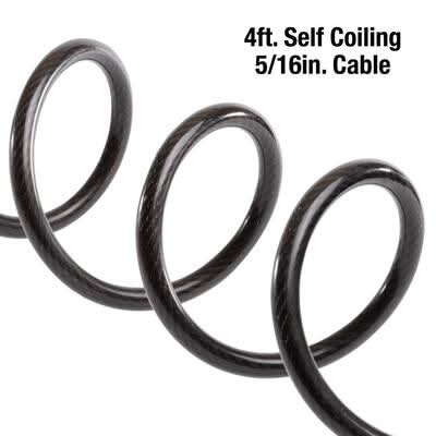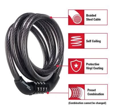 The Master Lock 8143D Bike Lock Cable with Combination is 4 ft. (1.2 m.) long and features a 5/16 in. (8 mm.) diameter braided steel for maximum strength and flexibility. Bike lock cable includes a protective vinyl coating which helps protect against scratches. Bike cable offers four-dial combination security for keyle This product can expose you to lead which is known to the State of California to cause cancer and birth defects or other reproductive harm. For more information go to www.P65Warnings.ca.gov. • Color: Black • Size: 4 ft
