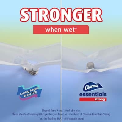Looking for TP that's big on strength, small on cost. Charmin Essentials Strong Mega Roll has you covered. It's 3X stronger when wet so it holds up while you clean. And we made sure it strikes the perfect balance of strength and value making it good for your butt and your budget. It's MEGA so it's long lasting for you and your family. It's also Roto-Rooter approved so you can roll Strong and flush confidently knowing it's clog-safe and septic-safe. Verses. The leading USA 1-ply bargain brand. • Size: 9.9 cm x 10.1 cm • Packaging: Reusable