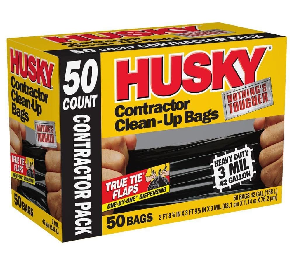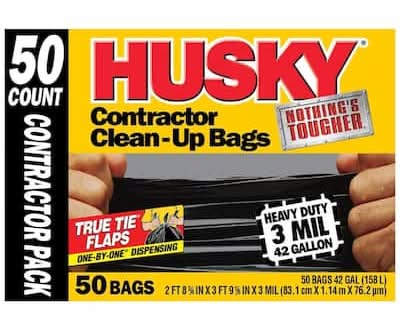 The HUSKY 42 Gal. Clean-up Bags (50-count) are ideal for all your tough clean-up jobs. Featuring a tear and puncture-resistant design, it includes true tie flaps and 1-by-1 dispensing for an easy use. Its 42 Gal. capacity is strong enough for contractor, commercial or home use. • Color: Black • Size: 2 ft 8 3/4 in x 3 ft 9 1/8 in x 3 mil