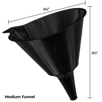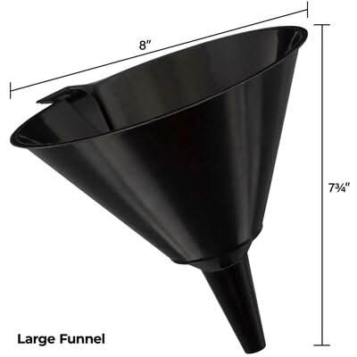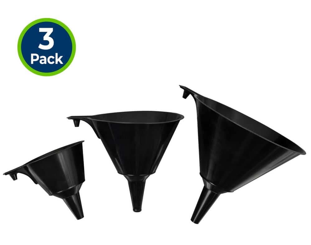 Convenient 3-piece funnel set includes small 4, medium 6 and large 8 sizes. Made of durable high-density polyethylene, these multi-purpose funnels are ideal for the DIY mechanic and are built to withstand the rigors of a shop environment. Wide openings allow for a quick pour and are perfect for adding motor oil, anti-freeze, transmission and windshield fluid.