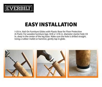 1-1/8 in. glides help chairs and other objects move with ease while protecting the surface below. Glides can be used on stools, chairs and tables. Perfect for straight, wooden furniture legs. Black cushions helps reduce noise and absorb shock. • Color: White • Size: 1.125 in