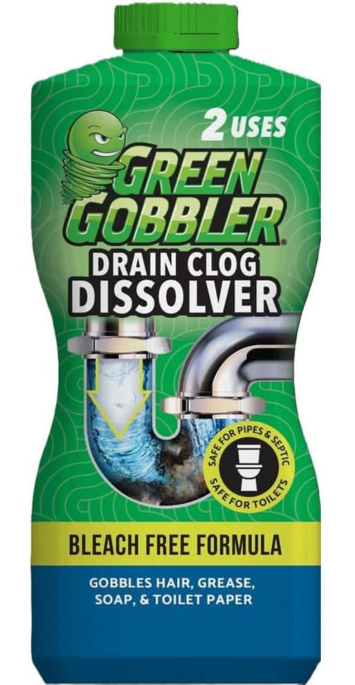 When slow-moving drains become a problem, it's time to send in Green Gobbler. Green Gobbler Drain Clog Dissolver cuts through the toughest clogs like soap scum, organic matter, toilet paper, grease and flushable personal care products to keep your pipes flowing properly. The high density formula sinks through standing water to reach your problem areas.From toilets to tubs to sinks, Green Gobbler is safe for all pipes and septic systems. It's free of odors and fumes, making it a great alternative to traditional bleach-based drain openers. That's right. Green Gobbler doesn't use any bleach or sodium hydroxide. We stand by our products and offer a 30-day money back guarantee if you're not satisfied with your results.
