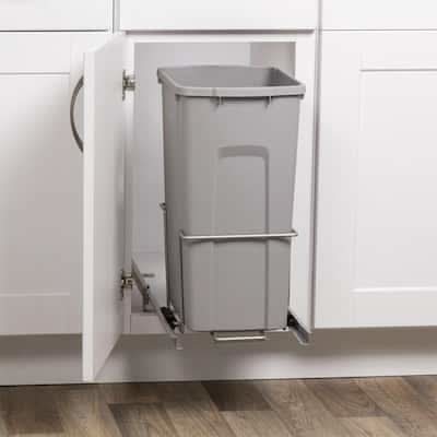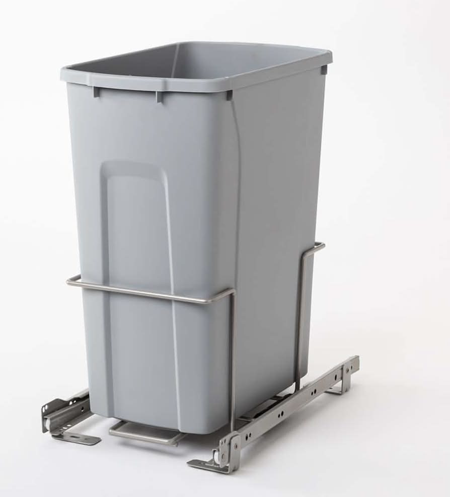 This Real Solutions 29 Qt. Single Trash Can with Pull-Out Steel Cage allows lengthwise or widthwise situation of the bin depending on your cabinet parameters. The roller slides can be placed 9.75 in. or 14.37 in. apart to accommodate plumbing or cupboard constraints. A sturdy, steel-constructed cage keeps the refuse receptacle steadily in place while the apparatus extends and retracts, inhibiting any spillage. Fasteners are included to mount the unit to the floor of a cabinet and one 29 Qt. white plastic garbage bin is included. Color: White