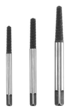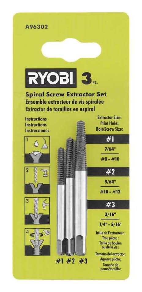 The RYOBI 3 PC. Spiral Screw Extractor Set is the perfect solution for easily removing stripped screws and bolts. With a durable steel composure and black oxide threads, these screw extractors are equipped to handle tough applications. The package features a sizing guide for assistance in picking the correct screw extractor and drill bit size for your application. In addition to your screw extractors, you will also need a drill with drill bits, hammer, Cancer and Reproductive Harm - www.p65warnings.ca.gov Size: 7/64"x9/64"x3/16"