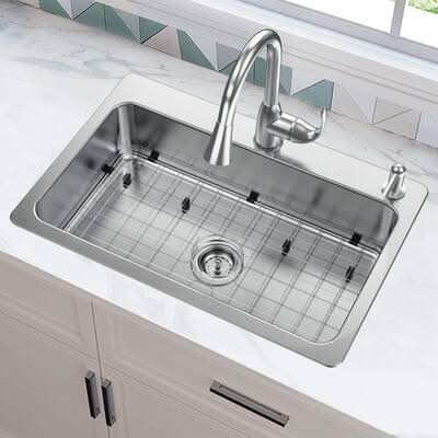 Glacier Bay all-in-1 dual mount kitchen sink can be installed as either a top-mount or under-mount. The sink is made of premium 18-Gauge stainless steel with a brushed finish to provide long-lasting use, while the insulated coating on the underside reduces waste disposal and water noise to help kee THIS PRODUCT CAN EXPOSE YOU TO CHEMICALS, INCLUDING LEAD, WHICH IS KNOWN TO THE STATE OF CALIFORNIA TO CAUSE CANCER AND BIRTH DEFECTS OR OTHER REPRODUCTIVE HARM. For more information go to www.P65Warnings.ca.gov