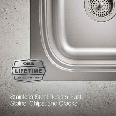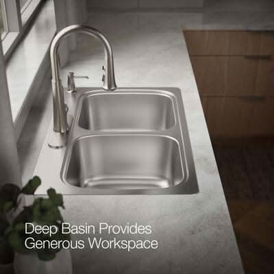 Blending with a wide variety of kitchen styles, this Verse double-basin sink features stainless-steel construction and a low-profile rim that simplifies cleanup, allowing you to sweep crumbs and liquid into the sink and out of sight. The engineered sound-absorption system significantly reduces disposal and dishwashing noise. It comes with a lifetime limited warranty.