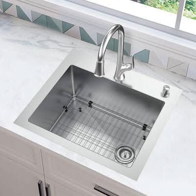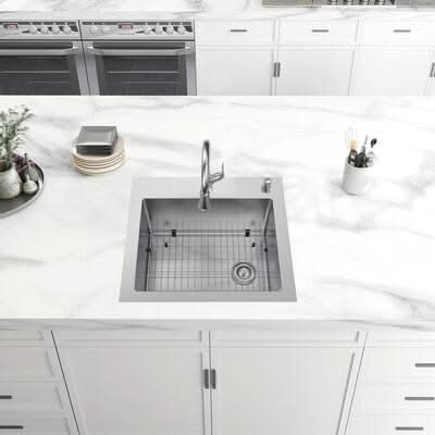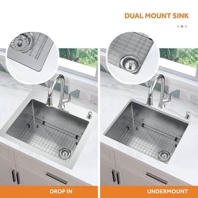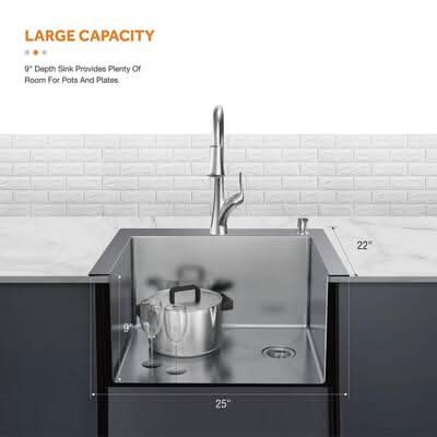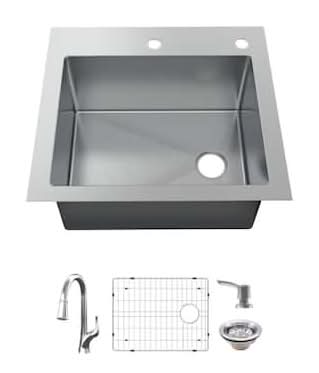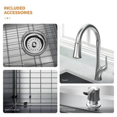 Enhance your kitchen interior with this Glacier Bay all-in-1-dual mount single bowl kitchen sink. It comes with a pull-down sprayer head, a bottom grid, a drain, a strainer, and a soap dispenser. You can install it as a drop-in or undermount, and it delivers noise reduction as you work. For easy cleaning, it offers tight 15 mm radius corners. To allow lasting use, this sink features sturdy corrosion-resistant 18-Gauge brushed stainless steel and a brushed nickel finish.