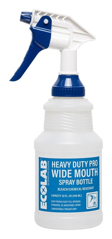 Ecolab 32 oz. Heavy-Duty Pro Wide Mouth Spray Bottle – Durable, High-Output Performance. Achieve efficient and powerful cleaning with the Ecolab Heavy-Duty Pro Wide Mouth Spray Bottle. Designed for professionals, this versatile spray bottle features a chemical-resistant construction and an extra-wide mouth for easy filling and pouring. It delivers over three times the spray output of standard bottles, reducing the number of sprays needed and saving you time and effort.