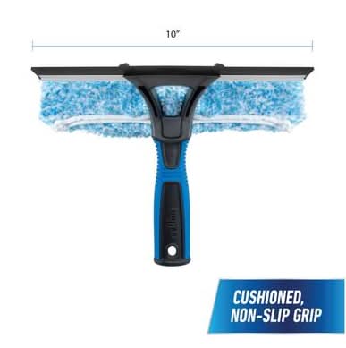 With both a scrubber and squeegee, the 10 in. 2-in-1 Window Cleaner is a quick, easy and effective way to clean outdoor windows without switching tools. The professional quality rubber blade, absorbent microfiber sleeve and cushioned grip make the 2-in-1 Window Cleaner the ideal window cleaning tool. Can be attached to pole for high access cleaning. Color: Blue-black