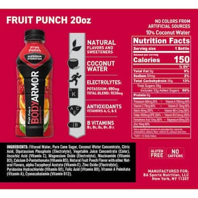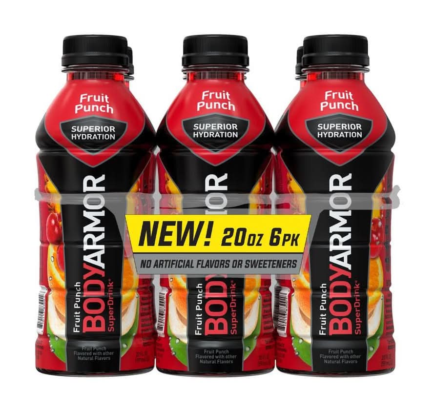 BODYARMOR Sports Drink hydrates today's athletes, no matter their game or goal by giving them the hard-working hydration they need to win. It's got potassium-packed electrolytes, antioxidants and no artificial sweeteners, flavors, or dyes. BODYARMOR. More Than a Sports Drink. • Flavor: Fruit punch • Pack size: 6 • Packaging: Reusable