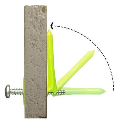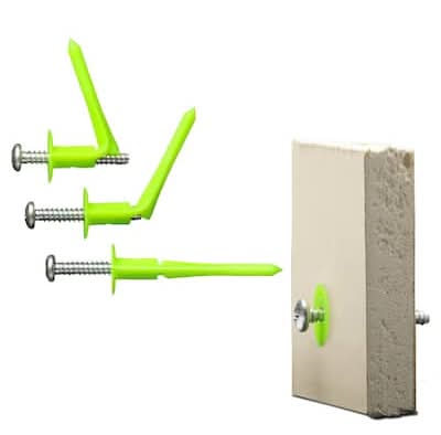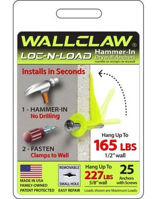 WallClaw LOC-N-LOAD Hammer-In drywall anchors are heavy-duty anchors that hammer-in to the wall like a nail.WallClaw LOC-N-LOAD anchors are the lowest cost drywall anchors per pound of load capacity.The knife-like body of LOC-N-LOAD anchors cuts into the wall leaving a small slit in the wall. The anchor blade behind the wall rotates up and clamps to the back of the wall as the screw is inserted.LOC-N-LOAD are removable and leave only a small slit in the wall, which is easily patched. No drilling, no mess.Hammer-In, Fasten, Done. LOC-N-LOAD installs in seconds. Easy to use, easy to remove, easy to repair.The patented strap hinge on LOC-N-LOAD anchors means it can be used in both 1/2 in. and 5/8 in. drywall.Perfect for a variety of home and office improvements like mirrors, pictures, towel bars, closet kits, curtains, bathroom accessories, wall decor, white boards, towel dispensers, clocks, and many other items.LOC-N-LOAD anchors are tested by an independent 3rd party construction materials testing laboratory and have a maximum weight capacity of 165 lbs. in 1/2 in. drywall and 227 lbs. 5/8 in. drywall.Recommend loads with a safety factor to account for variable site and installation conditions are 100 lbs. in 1/2 in. drywall and 138 lbs. 5/8 in. drywallWallClaw Anchors is a family owned business, and all our products are made, assembled and packaged. Color: Green