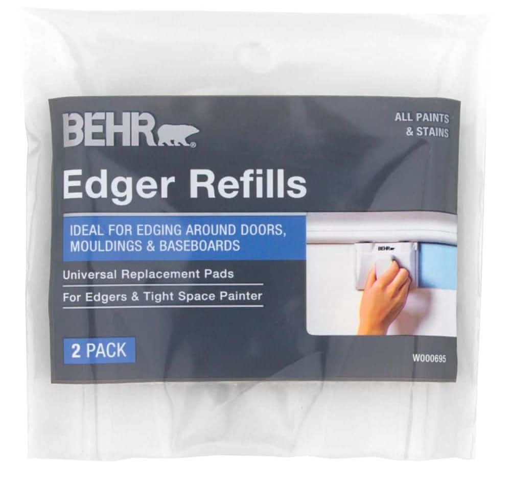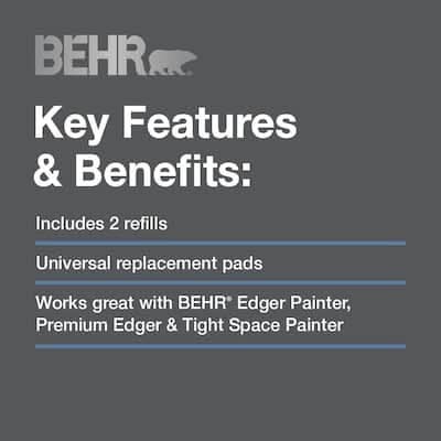 BEHR Edger Refills are universal replacement pads that work great with the BEHR Premium Edger, Edger Painter, and Tight Space Painter. BEHR edgers save you time and money by elimnating the need to tape around moulding or trim. Pads resist shedding for a smooth and even finish. Two refills are included per package. WARNING: Cancer and Reproductive Harm - www.p65warnings.ca.gov