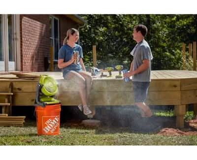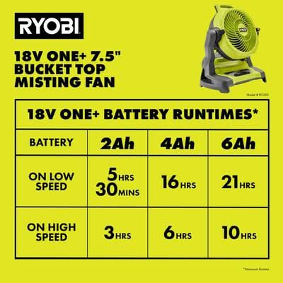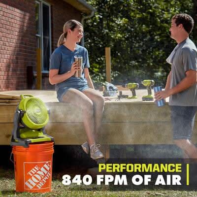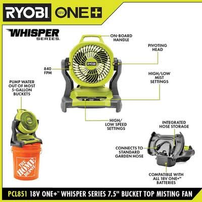 RYOBI Introduces the 18V ONE+ Cordless 7-1/2 in. Bucket Top Misting Fan Kit with 1.5 Ah Battery and Charger. Now part of our WHISPER SERIES, this fan is 44% quieter with 840 FPM (feet per minute) to keep you cool no matter the application. This misting fan is equipped with 2 speed and 2 mist settings. The pivoting head directs airflow/mist where it’s needed. Easily connect to standard garden hoses or pump water directly out of most 5-gallon buckets (S Cancer and Reproductive Harm - www.p65warnings.ca.gov Size: 7-1/2 In.