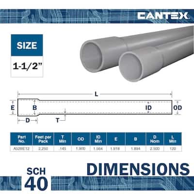 Protect and route your wiring with durable and versatile conduits from Cantex. This Schedule 40 PVC conduit is ideal for both underground and aboveground applications. Its sturdy construction protects electrical wires from potential damage while allowing easy installation in tight spaces. The 10-foot length provides ample coverage, while the diameter accommodates standard wiring needs. This bell-ended conduit ensures seamless connections, saving time and effort. It's engineered to resist corrosion, rust, and UV sunlight and it's perfect for indoor and outdoor environments. Our electrical conduit conforms to UL651 and NEMA TC-2 standards, guaranteeing reliable performance and safety. Our conduit is ETL-listed and is rated for conductors up to 90 degrees Celsius so you can meet the demands of modern electrical projects. Proudly made in the USA, it combines quality and compliance to suit professional and DIY installations.