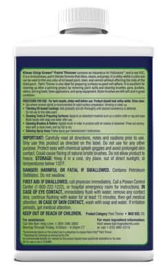 For Pro's and DIY'ers, Klean-Strip is the leading brand of solvents, thinners, removers, and cleaners that are dependable for reliable results. Klean-Strip Green Paint Thinner contains no hazardous air pollutants, no ozone-depleting chemicals, and is low VOC. It is a revolutionary, paint thinner formula that thins, cleans, and preps. Use to thin any color of oil-based paint, stain, and varnish without affecting the color of the dried paint. Paint Thinner is also ideal for removing dirt from metal, plastic, wood, and painted surfaces so paint will adhere. It is excellent for cleaning up after a painting project by removing paint spills and cleaning brushes, pans, buckets, rollers, stirring tools, foam applicators, and spray equipment. Read entire label prior to use or storage. Keep out of reach of children. Not for sale in South Coast AQMD.