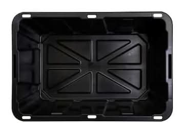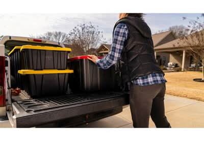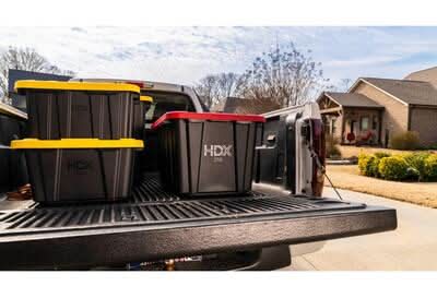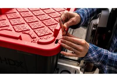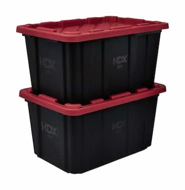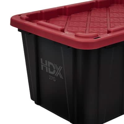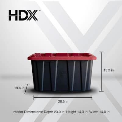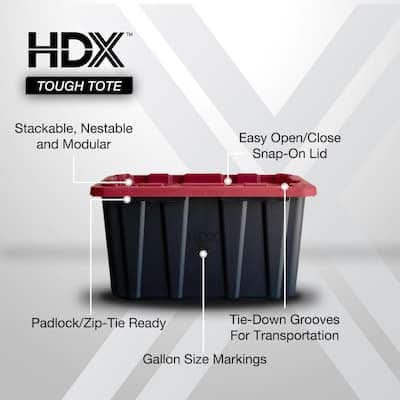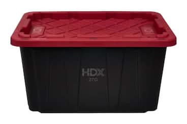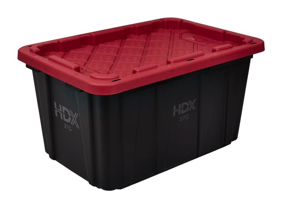 This heavy-duty HDX 27-Gallon Tough Tote is designed to handle all your storage needs. The recessed lid enables you to stack multiple units effortlessly, while the tapered design facilitates easy nesting when you need to store them. With a sturdy black base crafted from high-grade resin and a red snap lid, your items are safe and protected. Ideal for the thorough organizer seeking top-tier storage solutions, this tote features integrated slots for locking to deter unwanted access. Its unique tie-down channels also make it easy to secure for hassle-free transport and it's compatible with most hitch mounted cargo carriers. So that you can easily recognize what size your tote is, the gallon size is clearly visible on both the base and the lid. Embrace the essence of organized living with HDX Tough Totes! Color: Black-red