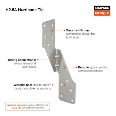 The H2.5A single-sided hurricane tie is designed to resist moderate loads at the rafter/truss-to-top-plate connection. As part of a continuous load path, the H2.5A resists both lateral and uplift loads. The symmetrical design eliminates the need for separate right and left parts.
