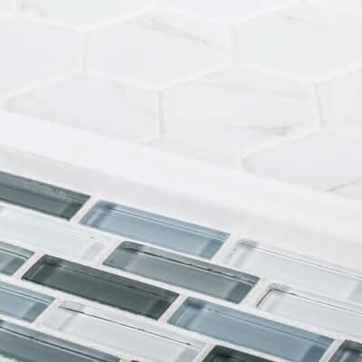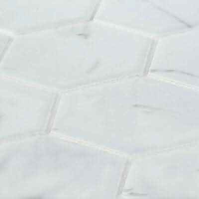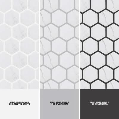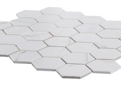Brighten up your bathroom with Whisper Valley 11 in. x 12-5/8 in. Porcelain Mosaic. The mosaic's bright white color features printed grey veining for a marble look at a value price. The hexagon pattern creates a modern look and the porcelain material offers durability and convenience. Combine with other mosaics and field tiles to create impressive installations. For best installation results, use white polymer-modified thinset.