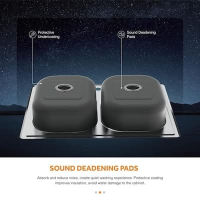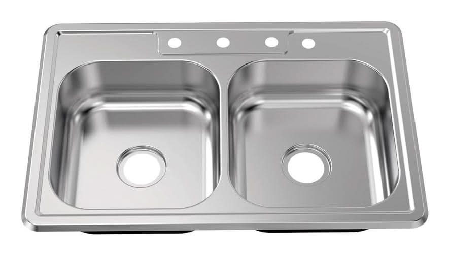 This Glacier Bay kitchen sink features an insulating undercoat that not only dampens noises and vibrations, it inhibits condensation buildup and helps stabilize water temperature in the double bowls. Simple yet stylish, the gleaming 22-Gauge stainless steel construction provides strength and durability for years of lasting use while the clean lines and gently rounded corners provide visual allure. The drop-in sink is pre-drilled with four holes to accommodate a faucet and sprayer, soap dispenser or other accessories (sold separately), ready to occupy a 33 in. x 22 in. footprint on your countertop.