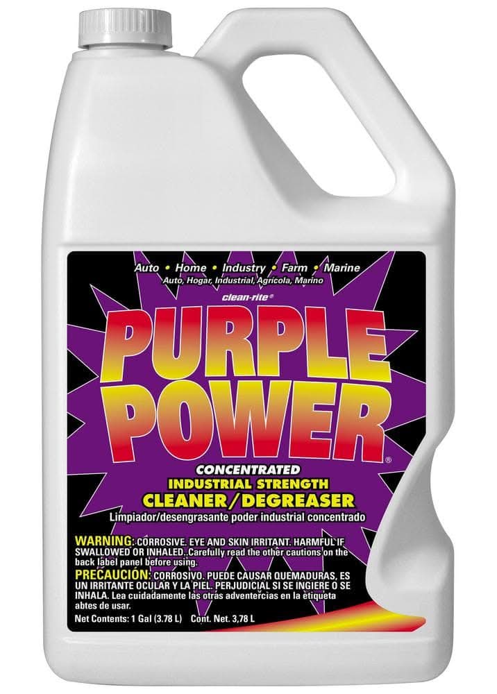 Purple Power has been the #1 purchased brand of degreasers nationwide since 2003 (in the automotive aftermarket, as rated by the NPD Group). This powerful cleaner and degreaser penetrates grease, oil and dirt on contact, wiping away even the toughest stains in just seconds. Clean carpet, concrete, fabric, fiberglass, plastic, porcelain, rubber, slate, stainless steel, stone, tile, vinyl and natural pressure treated wood with Purple Power Degreaser. This powerful cleaner powers away even the most built-up messes. Purple Power cleaner and degreaser makes a great addition to your collection of household basics and removes even the toughest dirt, grime and grease. This potent formula serves as a multi-use cleaning solution and clears residue, grease and scum from many surfaces and areas with ease. Use Purple Power Degreaser at home, in a factory, auto body shop or on the farm. This 1 Gal. degreaser is extremely versatile and can be used for a wide variety of applications. For safety, this cleaner degreaser is non-flammable and non-abrasive.