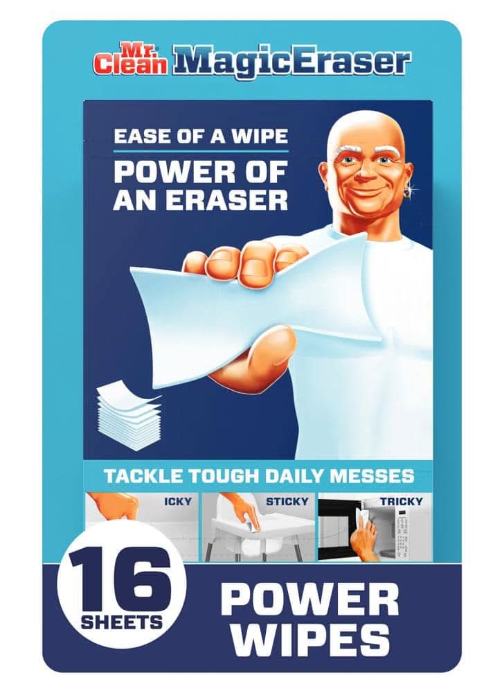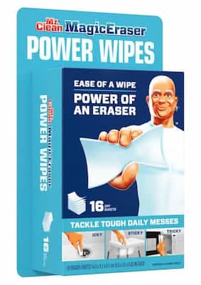For a heavy-duty clean in hard-to-reach places, there's nothing quite like Magic Eraser Cleaning Sheets. Muscle out grime in nooks and crannies, hard to reach corners and more. Ideal for scrubbing greasy stove tops, tough stains in microwaves, grimy fridge handles, hard water spots and stains on sinks and faucets, in the bathroom and even more. For when cleaning spray and wipes won't cut it. • Procter & Gamble, Cincinnati, OH, 45202 • Packaging: Reusable