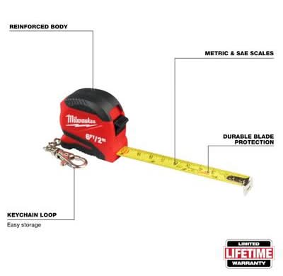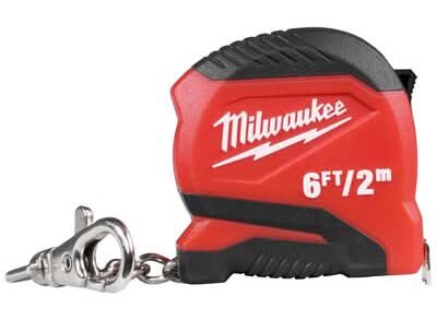 The MILWAUKEE 6ft/2m Keychain Tape Measure is equipped with durable blade protection and a reinforced body for protection against damage. For added portability, a secure, heavy-duty keychain clip gives it the versatility to clip on belts and keychains. The Keychain Tape Measure is dual printed in Metric and SAE scales. Size: 6 ft