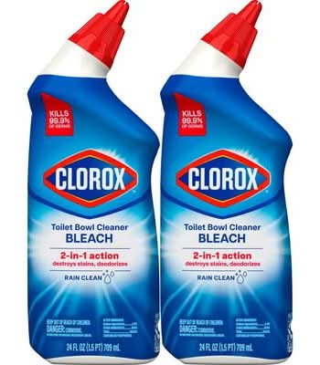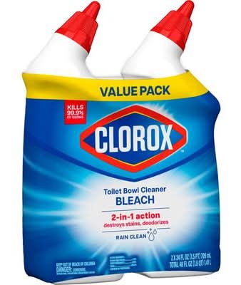 For a clean, fresh toilet, use the only manual toilet bowl cleaner with the power of Clorox bleach. Clorox Toilet Bowl Cleaner Bleach is fortified with 2 in 1 action that destroys stains and deodorizes, leaving a refreshing Rain Clean scent. This toilet bowl disinfectant kills 99.9% of germs (1) and features a thick coating formula that dissolves stains for deep down cleaning. Target odor causing bacteria, unsightly toilet rings and mold and mildew stains all with a non abrasive formula that will not scratch surfaces. See how the power of Clorox bleach in a convenient gel formula can make your cleaning job easier and leave your toilet bowl bleach clean. (1) When used as directed. • Pack size: 2 • The Clorox Company, 1221 Broadway,Oakland,CA,94612