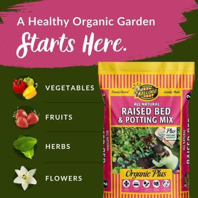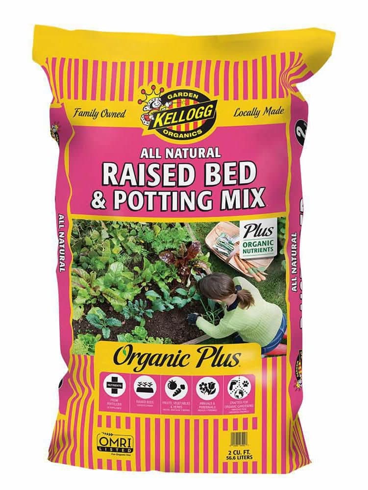 Transform your raised beds and containers into thriving gardens with Kellogg Garden Organics All Natural Raised Bed and Potting Mix. This nutrient-rich, all-natural mix, is specially crafted for raised beds and outdoor container gardening. Packed with organic goodness, it provides the perfect environment to support healthy growth for your vegetables, fruit, herbs, and flowers.Simply fill your raised bed or container, leaving about 3 inches from the top, and plant. Be sure to water thoroughly after planting to give your garden the best start.Pro Gardening Tip: Boost growth by mixing in organic granular plant food when planting, then reapply every 5-6 weeks. Size: 2 cu ft