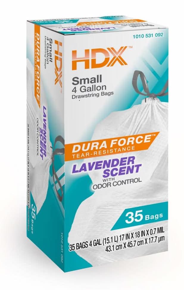HDX Trash Bags with lavender scent provide strength plus odor control, to keep your home smelling fresh and clean. Has the flex technology which allows more room in bag yet durable without ripping or tearing open. The drawstring closure ensures a tight grip on trash cans and makes for a simple removal with a quick cinch of the durable drawstring. The smaller size trash bag is perfect for smaller trash cans and are great for the bathroom, in home office, bedroom and laundry room. Size: 17 In X 18 In