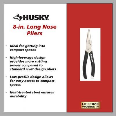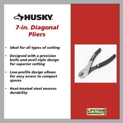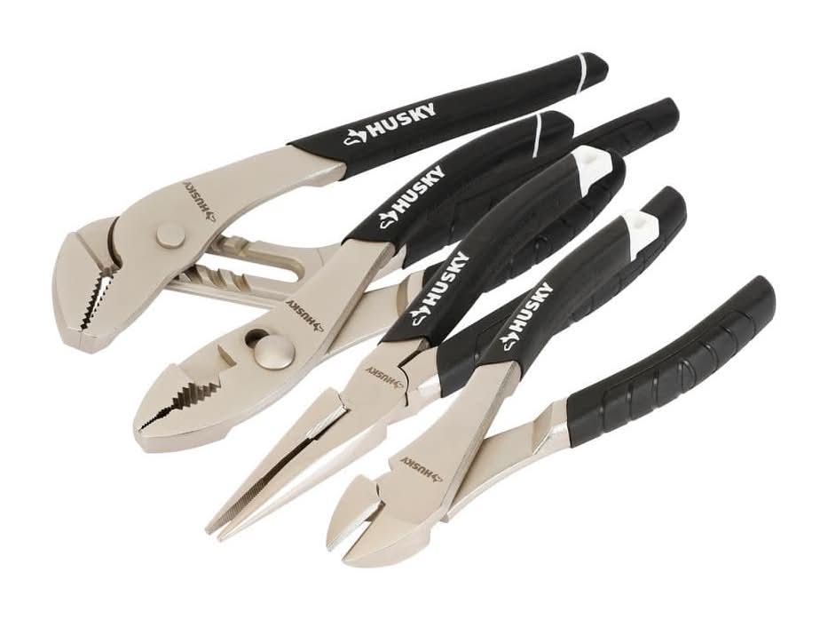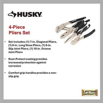 The 4-piece Pliers Set includes one 7 in. Diagonal Pliers, one 8 in. L Nose Pliers, one 8 in. Slip Joint Pliers, one 10 in. Groove Joint Pliers. The 7 in. H Leverage Diagonal Pliers are specially designed for cutting, rather than gripping or pulling. The jaws are sharp to cut closely and efficiently. They 8 in. H Leverage Long Nose Pliers can be used for a multitude of tasks. They are ideal for getting into tight spots. The 8 in. Standard Slip Joint Pliers are used for turning or bending small objects. They are designed to allow the worker to apply force to the object being gripped. The 10 in. Groove Joint Pliers also known as tongue and groove pliers are often used for gripping irregularly shaped objects. They can also be used for clamping materials. This set is a must have for any tool box.