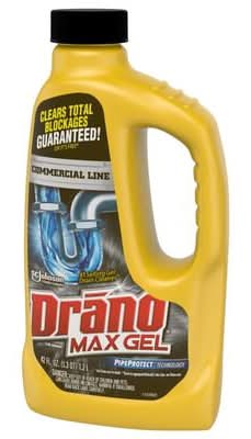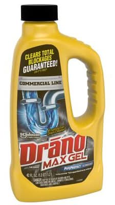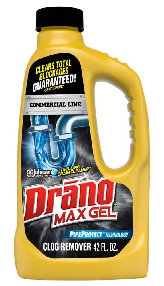 When you have a clogged sink, tub, shower, or other drain, take charge and get it flowing fast with professional strength Drano commercial clog remover. The thick bleach formula in Drano Max Gel Commercial Line cuts right through standing water, clinging to your toughest clogs to blast them fast. As an industrial drain cleaner, commercial Drano Max Gel starts working in 15 minutes to completely remove built up blockages. It's safe to use on metal and plastic pipes and made without phosphorus.Conquer tough clogs whenever they happen with Drano commercial gel drain opener. Its pro strength formula works great to remove hair clogs, soap scum, standing water, slow drains, and pipe build ups. Just pour, wait, and flush drain.See instructions on bottle for additional usage instructions and precautions. • S.C. Johnson & Son, Inc., Racine, WI, 53403-2236 • Packaging: Reusable