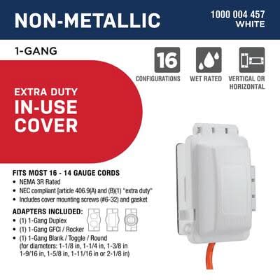 Commercial Electric non-metallic while-in-use device covers provide weatherproof protection when an outlet is in use. While-in-use covers are made from high-impact polycarbonate construction providing maximum durability. An attached gasket, mounting hardware and installation instructions are included. WARNING: Cancer and Reproductive Harm -- www.P65Warnings.ca.gov Color: White