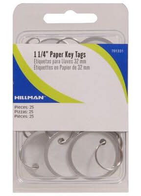 Keep your keys classified and cohesive with this 25-pack of Hillman paper key tags with wire rings. The dual-sided paper tags grant the opportunity to categorize key collections and personalize each key to your preference and specification. Attractive silver-wire rings make attachment simple and give a coordinated look to an assortment of keys. The compact size means these Hillman paper key tags with wire rings California residents see Prop 65 WARNINGS: Cancer and Reproductive Harm - www.P65Warnings.ca.gov Size: 1-1/4 In