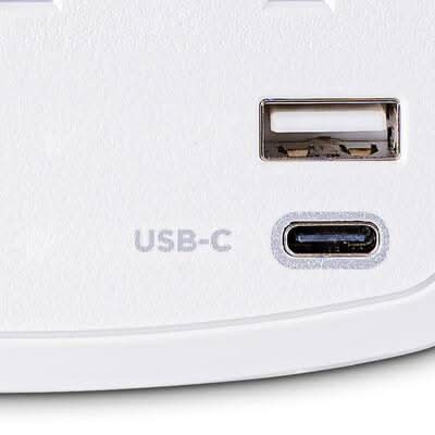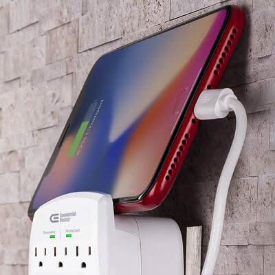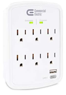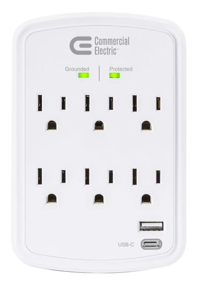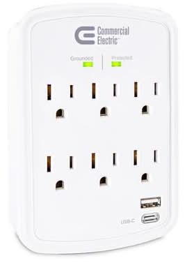 The Commercial Electric 6-Outlet Surge Protector Wall Mounted in White turns 2 wall outlets into 6. Outlets get crowded when phone chargers and electronics have to share the standard receptacles found in most homes. Expands a This product can expose you to chemicals including styrene, which is known to the State of California to cause cancer, and bisphenol A (BPA), which is known to the State of California to cause birth defects or other reproductive harm. For more information go to www.P65Warnings.ca.gov. Color: White