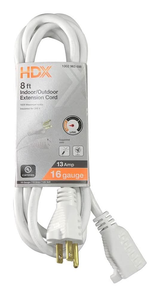 This HDX 8 ft. 16/3-Gauge Extension Cord is versatile for indoor/outdoor job sites and household use. Rated for 13 Amp and 125-Volt. Reinforced blades and molded plugs prevent accidental bending and breaking. cULus Listed. Light-duty. Durable and Flexible. WARNING: This product can expose you to chemicals including lead, which is known to the State of California to cause cancer and birth defects or other reproductive harm. For more information go to www.P65Warnings.ca.gov • Color: White • Size: 8 ft