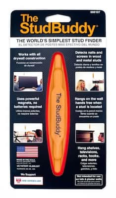 The StudBuddy is The World's Simplest Stud Finder. The StudBuddy stud finder hangs on the wall hands free for visual reference when hanging shelves, cabinets, paintings, mirrors, hooks, flat screen televisions and other heavy objects. The simple to use stud finder works with all drywall applications by locating nails and screws in wood and metal studs. No batteries, electronic or moving parts. Having spent the last 40-years as a framer, carpenter, builder, designer and general contractor, The StudBuddy creator felt there must be a simpler and more accurate way of locating framing studs. Many people get frustrated with using electronic stud finders, the tapping method or drilling multiple holes to locate studs which can be costly to repair and repaint. Several-years ago, while playing with strong neodymium magnets, The StudBuddy inventor suddenly saw the ease of locating drywall nails and screws and therefore, stud location.