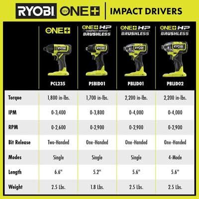 RYOBI introduces the 18V ONE+ Cordless 1/4 in. Impact Driver Kit with (2) 1.5 Ah Batteries and Charger. The 18V ONE+ Cordless 1/4 in. Impact Driver comes equipped with a powerful motor that provides 1,800 in./lbs. of torque. The 1/4 in. quick connection collet ensures convenience while switching out bits. The on-board LED worklights creates extra visibility for all your projects needs. The included batteries and charger are compatible with all RYOBI 18V Cancer and Reproductive Harm - www.p65warnings.ca.gov Size: 1/4 in