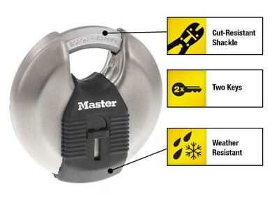 The Master Lock M50XD Heavy-Duty Outdoor Shrouded Padlock with Key, features a 3-1/8 in. (79 mm) wide stainless steel body for maximum strength, reliability and corrosion resistance. Lock is fully shrouded to minimize shackle exposure and protect against bolt cutter attacks. Octagonal lock shackle is 7/16 in. (11 mm) in diameter and is 11/16 in. (17 mm) long and made of Tough-Cut boron-carbide, 50% harder than hardened steel, offering maximum resistance from cutting and sawing. Lock 4-pin cylinder prevents picking and the dual locking ball bearings provide maximum resistance against prying and hammering. Shrouded padlock covered keyway offers maximum weather protection and reinforced body bumper protects against scratches. Master Lock's Lifetime Guarantee provides peace of mind from a brand you can trust. Size: 3-1/8 In