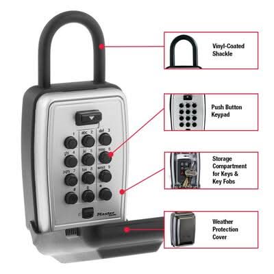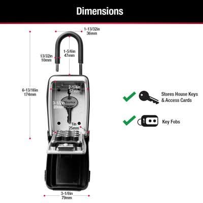 The Master Lock 5422D Lock Box, Resettable Push Button Combination features a 3-1/8 in. (79 mm.) wide metal body for durability. Portable lock box shackle design offers over the door mounting for convenience. Lock box shackle is 1-5/6 in. (47 mm.) long, 1-13/32 in. (36 mm.) width and 13/32 in. (10 mm.) diameter. Set your own comb This product can expose you to BPA, which is known to the State of California to cause birth defects or other reproductive harm. For more information go to www.P65Warnings.ca.gov.