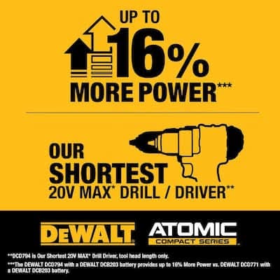 Unlock power in a compact size with the ATOMIC COMPACT SERIES 20V MAX 1/2 in. Drill/Driver. Get up to 16% more power for a variety of drilling applications in tight spaces with our shortest 20V MAX Drill/Driver (tool head length only). The LED work light illuminates small spaces to optimize productivity on the job site.