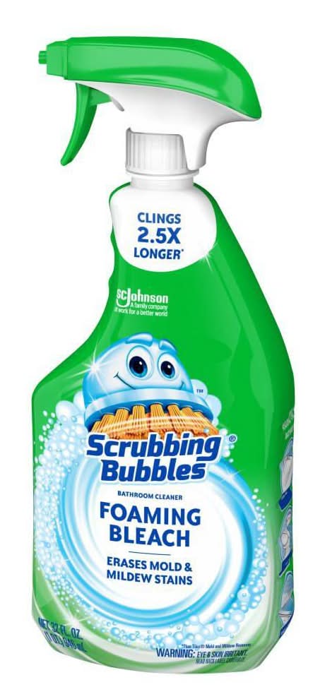 Scrubbing Bubbles Foaming Bleach Bathroom Cleaner is a deep penetrating foam that clings to your bathroom surfaces, scrubbing away bathroom stains. The unique trigger dispenses a foam that erases mold and mildew stains, cleans soap scum, and leaves behind a brilliant shine.No more mister nice scrub! Scrubbing Bubbles Bleach Cleaner puts the stain-fighting power of bleach in a deep-penetrating foam to cling to bathroom surfaces, wipe out soap scum and send mold and mildew stains running for the drain. So, drag out the nice bath mat. There's a foam party scheduled for your bathroom and dirt and grime is getting uninvited.Bleach-powered foam that helps brighten the home? That's cleaning reinvented. S.c. Johnson & Son, Inc., Racine,WI,USA,53403-2236