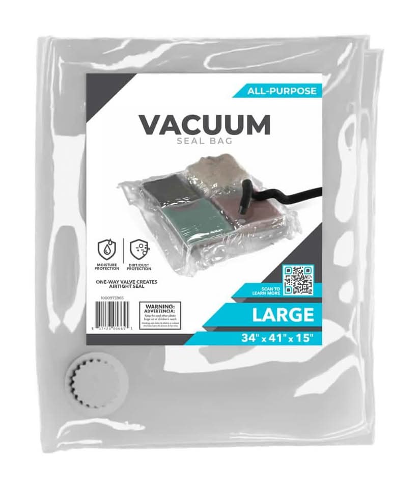 The Pratt Retail Specialties' Large Vacuum Storage Bag is a simple to use way to save packing space and to protect items from the elements for long term storage. These tough and durable air tight bags provide and air and water tight seal when used properly. These bags and be used without a vacuum by simply opening the valve and squeezing air out of the bag. Size: Large
