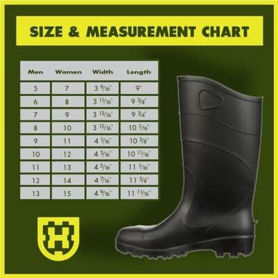Sturdy, comfortable and long-lasting waterproof "over the foot" rubber blend boot. Protects feet from water, mud, muck, cement, soaps and detergents, cleaning chemicals, grass, yard waste, snow, and more. Perfect for keeping feet dry indoors and outdoors in wet places, floods, gardens, yards, pools, shorelines, basements, and on the farm. Used in pouring cement, construction, walking the dogs, animal care, pool maintenance, power washing, car washing, basement and outdoor clean ups. 100% sealed waterproof for durability and safety in slippery, liquid, soapy, and muddy places Ergonomically designed foot cavity with great support and comfort Slip-resistant, high evacuation outsoles support easy cleaning Designed for over the foot, not over the shoe Roomy foot cavity and tapered upper to reduce calf area irritation, and be easy on easy off Sized for a medium "D" width and large foot cavity to accommodate thermal socks, or orthotic footbeds (not included) Woman's sizing is 2 sizes smaller than men's Graduated boot heights (consistent with shoe sizing) provide better fit and comfort Templates for cutting out pull on holes if desired. • Color: Black • Size: 11