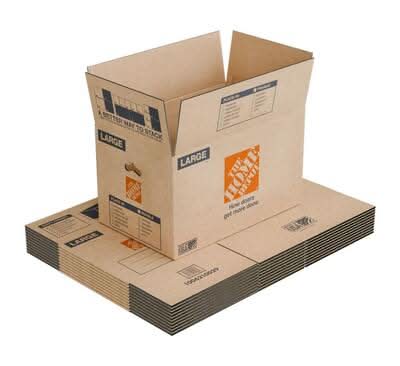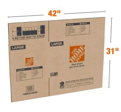 The Home Depot Large Moving Box is great for moving and storing lightweight and bulky items. Ideal for clothing, lampshades, pillows, stuffed animals, toys, and more. This box is crafted from 100% recycled material for an environmentally responsible moving and storage option. • Size: L • Packaging: Reusable