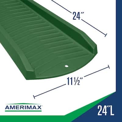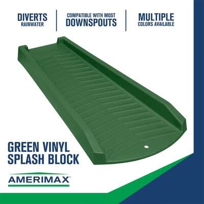 For an easy and convenient way to divert damaging rainwater away from your foundation, look no further than the Amerimax Splash Block. The unique cut out in the back of the extra long splash block allows it to fit underneath your downspout. This product also features a hole in the front of the splash block allowing it to be secured to the ground with a landscape spike (not included); thereby preventing the product from being impacted weather or wind. The durable resin construction is able to withstand the elements. • Color: Green • Size: 24"
