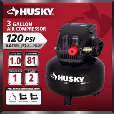 The Husky 3 Gal. 120 PSI Portable Electric Oil-Free Light Duty Pancake Air Compressor with Fold Down Handle and 1-Quick Coupler offers a dependable solution for inflation needs. Fast Inflation highlights its ability to quickly inflate tires, sports balls, and air mattresses, powered by a 1/3 HP mot This product can expose you to chemicals including lead, which is known to the State of California to cause cancer and birth defects or other reproductive harm. For more information go to www.P65Warnings.ca.gov. Size: 3 Gal
