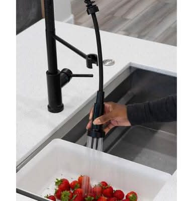 Modernize your kitchen with the Glacier Bay Paulina Single-Handle Spring Neck Pull-Down Sprayer Kitchen Faucet in Matte Black with TurboSpray and FastMount. The look adds an industrial touch and will complement your modern kitchen. This faucet boasts a single-handle design and a matte black finish. It also houses a convenient pull-down spray wand with 2-spray modes; aerated spray and TurboSpray which provides a stronger spray pattern to clean pots, pans and other dishes. A ceramic disc cartridge offers drip-free performance and a 1.8 GPM flow rate. The exclusive FastMount mounting system makes installation quick and easy.