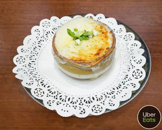 Beef broth, caramelized onion, and crostini with mozzarella.