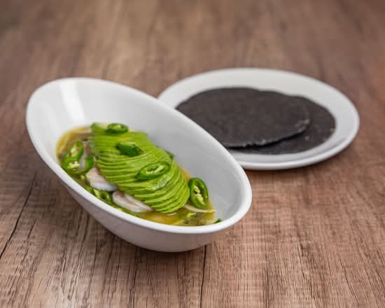 Wild caught gulf shrimp, avocado, jalapeño, serrano pepper, English cucumber, red onion, burnt tortilla oil, and Oaxacan heirloom corn tostadas
