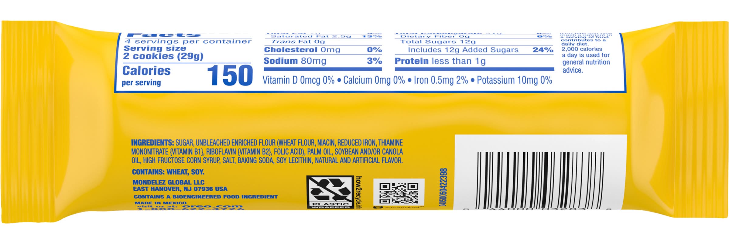 OREO Double Stuf Golden Sandwich Cookies are the favorite for those who like double creme in their golden OREO cookies. These vanilla sandwich cookies are filled with twice as much classic OREO creme filling, making them supremely dunkable and delicious. Shareable king size OREO cookie snack packs include eight OREO Double Stuf cookies making them perfect for sharing. Individually wrapped OREO cookie king size packs are great for taking on the go as travel snacks or packing in lunches for an office snack. • Brand: Oreo • kosher • Number of servings: 4 • Mondelez Global LLC, East Hanover, NJ, 07936
